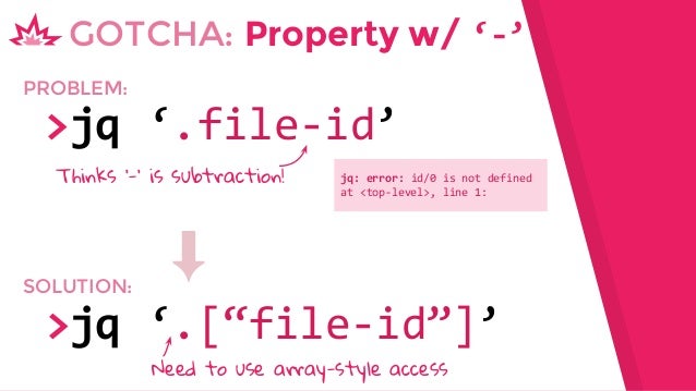 In other words quotes can only be omitted if the property name is a numeric literal or a valid identifier name. Most of the popular API and data services use the JSON data format so well learn how its used to serialize interesting information and how to use the jq to parse it at the command-line. A jq program is a filter.