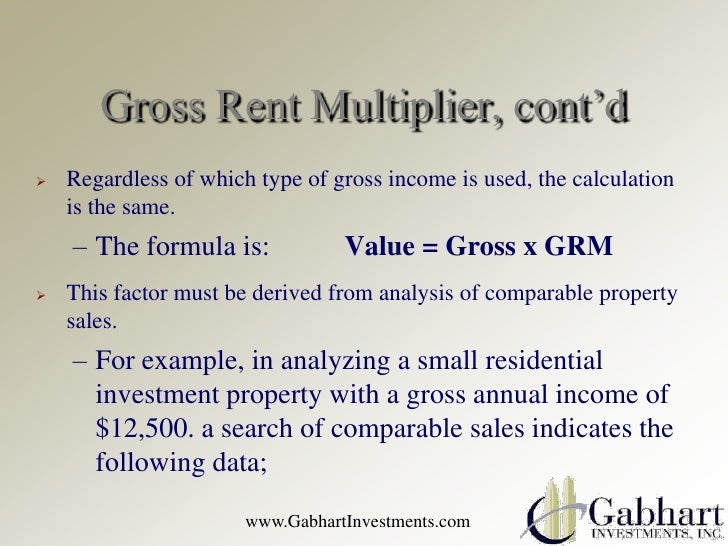 Gross Rent Multiplier Property CostGross Annual Rent You can manipulate the equation a bit too. The formula to calculate GRM is. The formula is as follows.