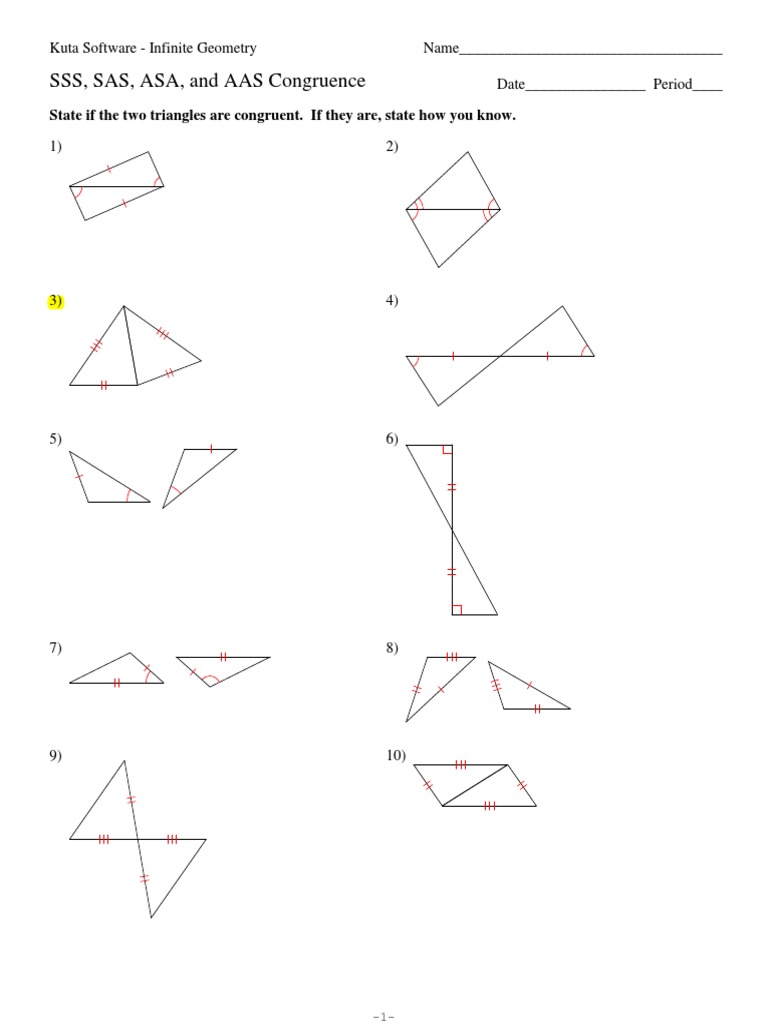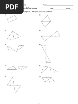 1 Not congruent 2 ASA 3 SSS 4 ASA 5 Not congruent 6 ASA 7 Not congruent 8 SSS 9 SAS 10 SSS-1- 3 Y2v0V1n1 Y AKFuBt sal MSio 4fWtYwza XrWed 0LBLjC SN W uA 0lglq UrFi NgLh MtxsQ Dr1e gshe ErmvFe id R0 a. SSS side side side SSS stands for side side side and means that we have two triangles with all three sides equal. AAS or Angle Angle Side.