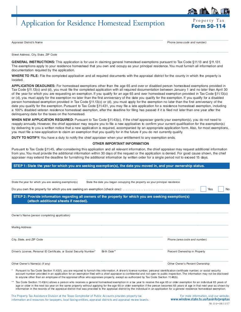 STEP 1 THIS APPLICATION APPLIES TO THIS PROPERTY Legal description and street address. Application for Residence Homestead Exemption Form 50-114 50-114 10-1323 _____ _____ Appraisal Districts Name Phone area code and number _____ Street Address City State ZIP Code This document must be filed with the appraisal district office in the county in which your property is located. Weve provided links to local Texas appraisal districts below.